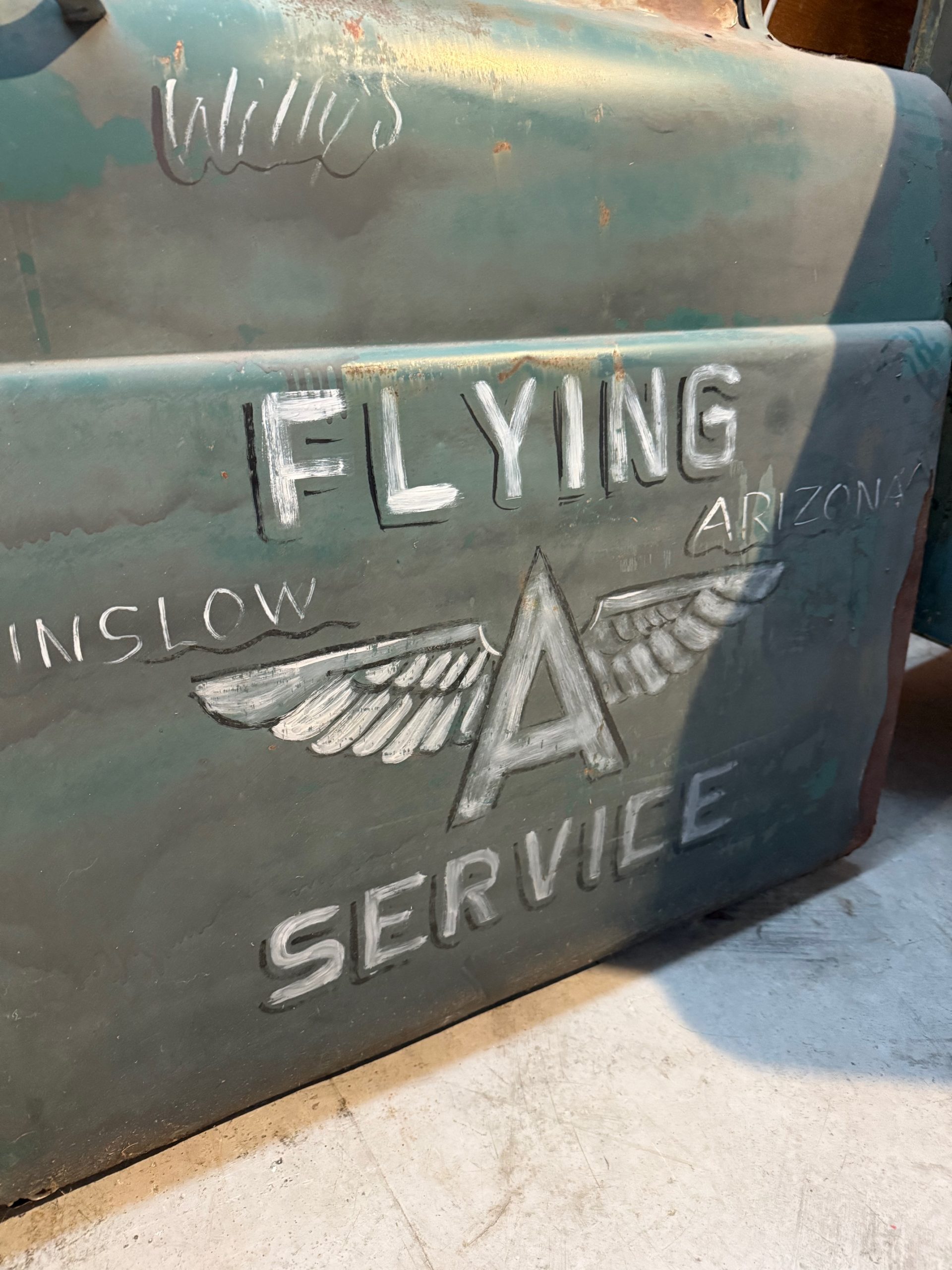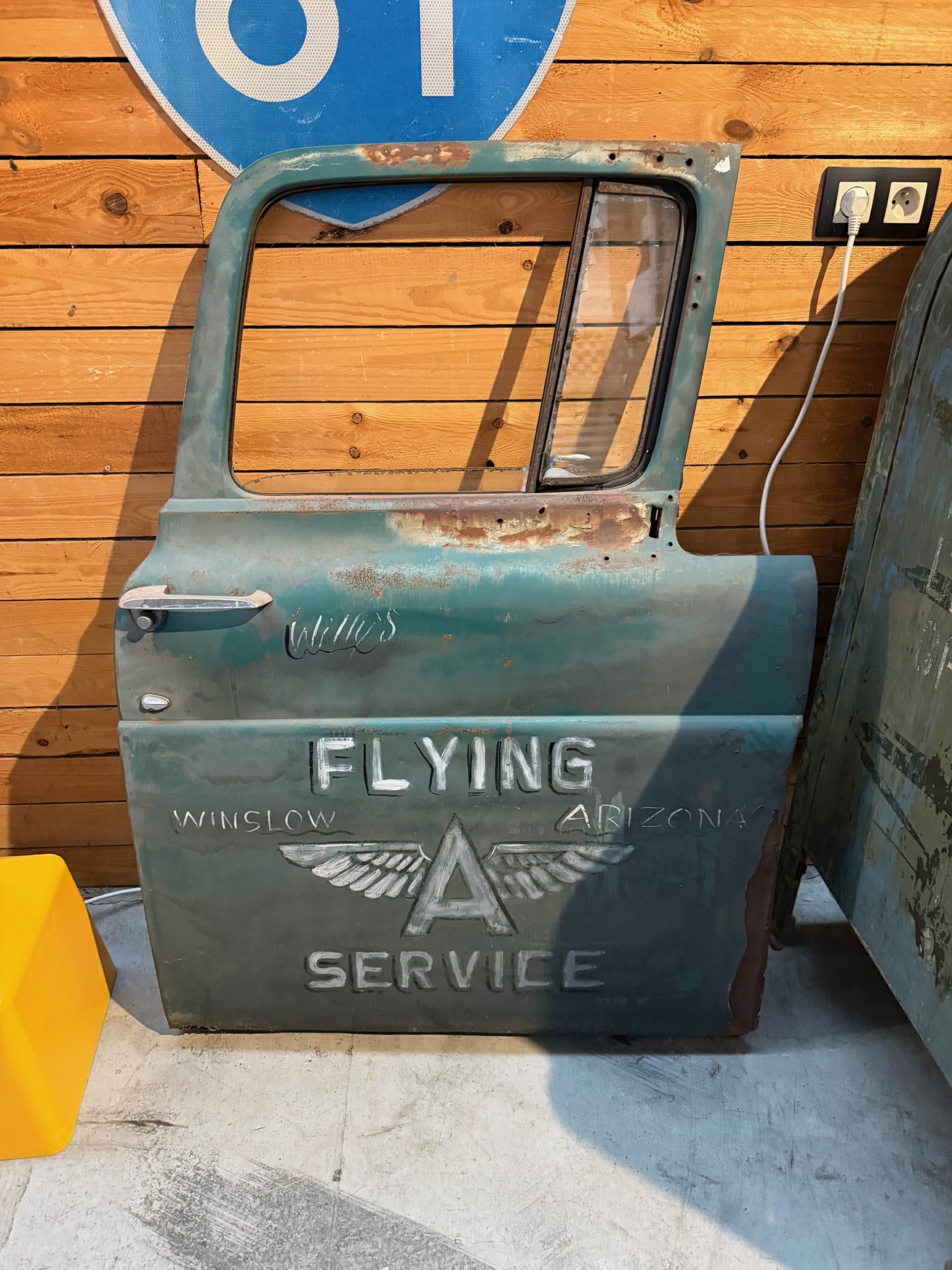 Authentique portière flying Gasoline, qui provient d’un pick up américain des années 60, le logo est peint à la main ( pas d’autocollant )
